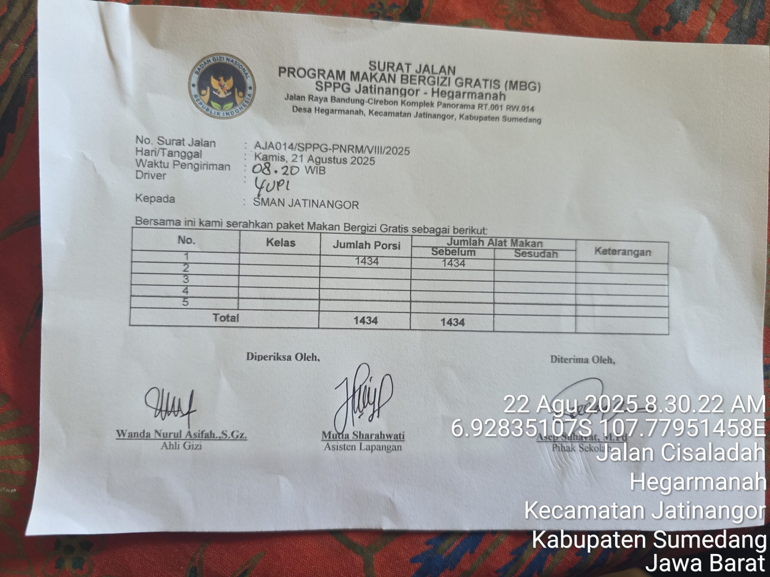 “Kami atas nama SMAN Jatinangor mengucapkan terima kasih kepada SPPG Panaroma Jatinangor. Bantuan MBG ini sangat bermanfaat dan akan segera kami bagikan kepada para siswa,” ungkapnya.